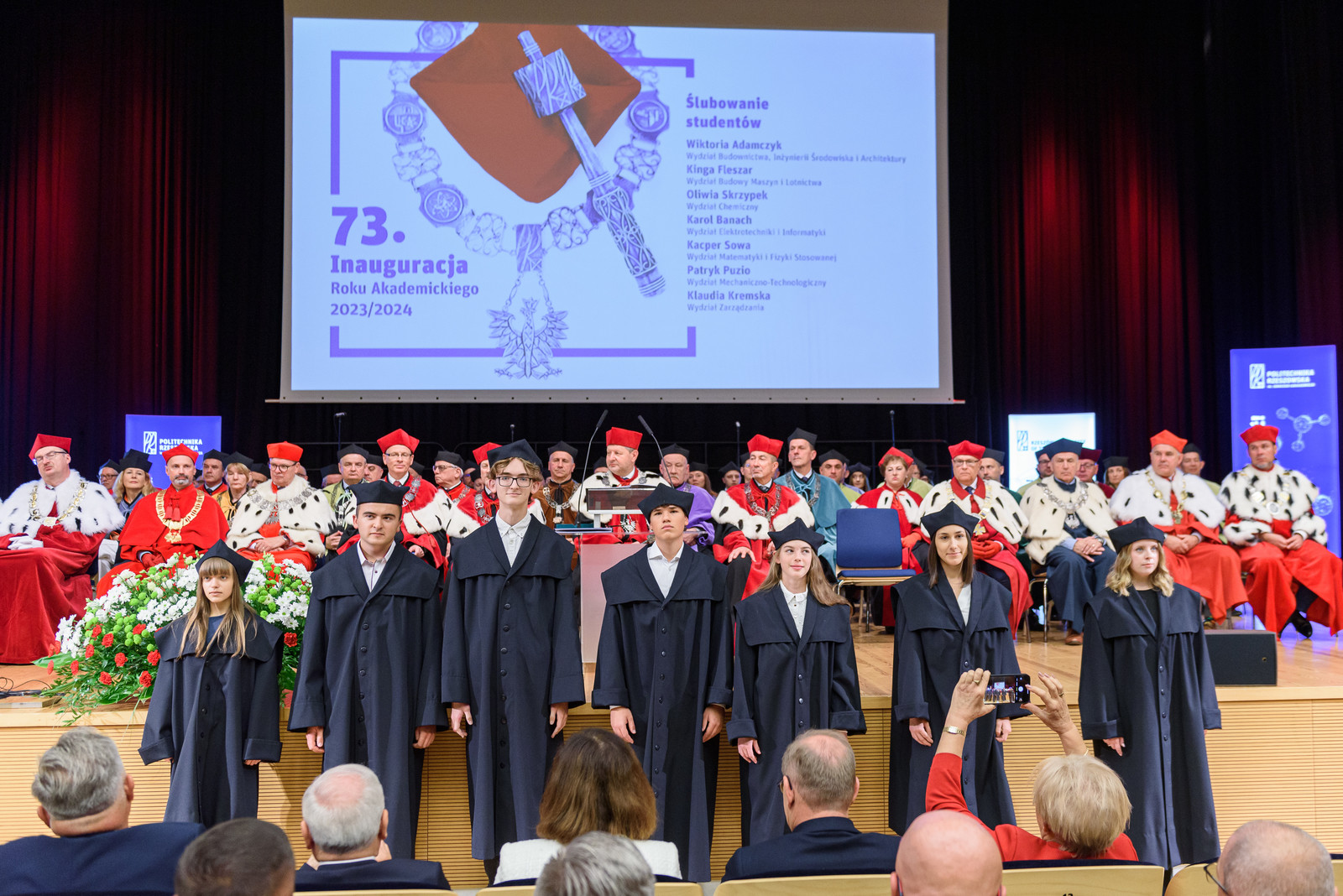 Ważną częścią uroczystości było ślubowanie przedstawicieli studentów pierwszego roku, które poprowadziła prorektor ds. kształcenia dr hab. Iwona Włoch, prof. PRz, oraz przedstawicieli doktorantów Szkoły Doktorskiej Nauk Inżynieryjno-Technicznych PRz, które poprowadził prorektor ds. nauki dr hab. inż. Lesław Gniewek, prof. PRz. JM Rektor dokonał pasowania studentów i doktorantów.